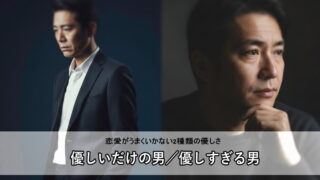 婚活20代・30代・40代向け 優しいだけの男/優しすぎる男の違い|恋愛がうまくいかない2種類の優しさ 優しくしているのに、なぜか恋愛がうまくいかない。「優しすぎるから無理」と別れを告げられた。どうすればいいのかわからない男性は少なくありません。実は、その優しさは「優しいだけの男」と「優しすぎる男」の2種類に分かれます。ここでは、優しいだけの... 2026.04.13 婚活20代・30代・40代向け